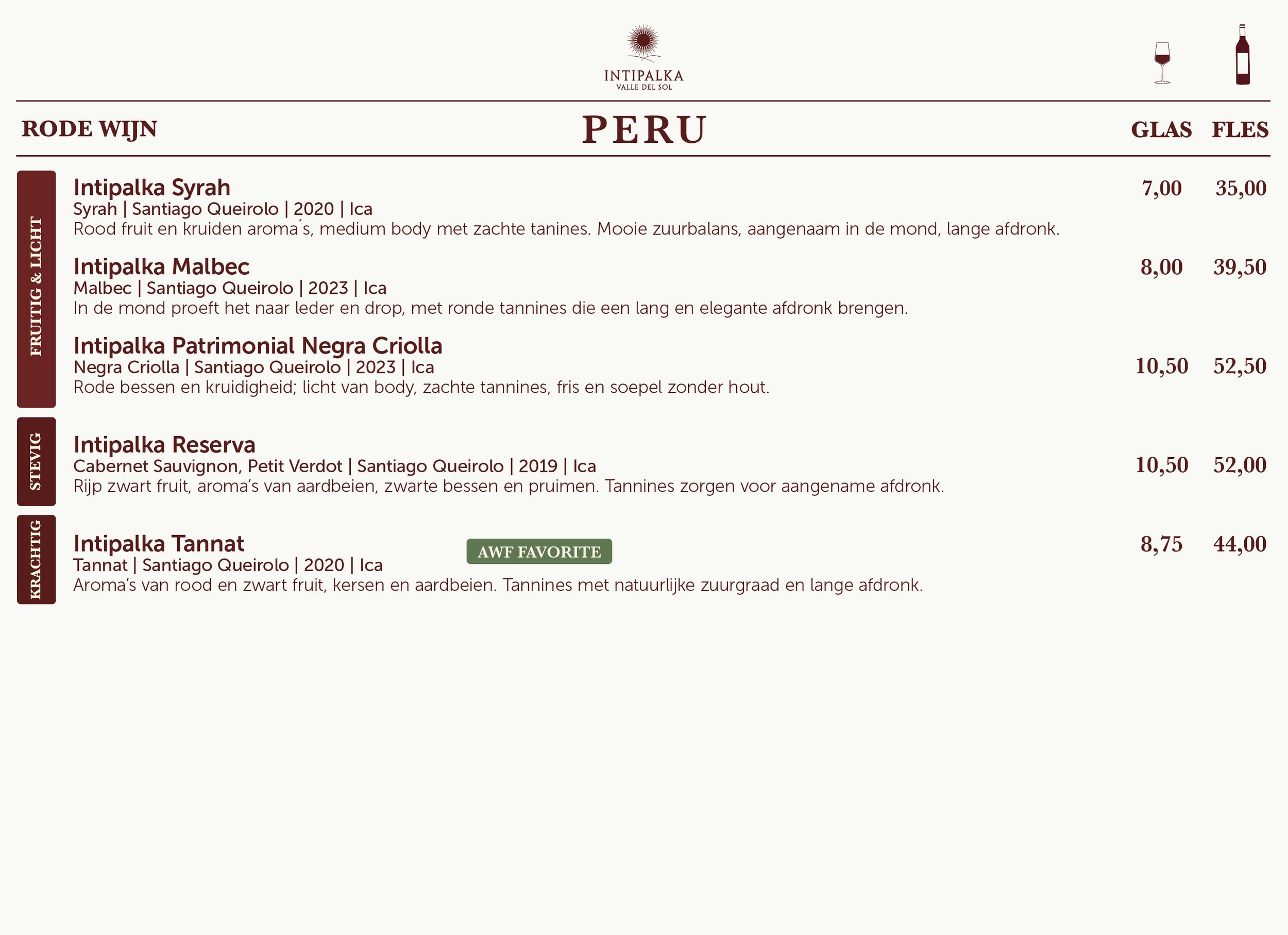 Een krachtige en diepgekleurde rode wijn voor wie van 'body' houdt. Tannat staat bekend om zijn stevige structuur, en deze Peruaanse variant stelt niet teleur: aroma’s van zwarte pruimen, bramen en een vleugje chocolade en leer.