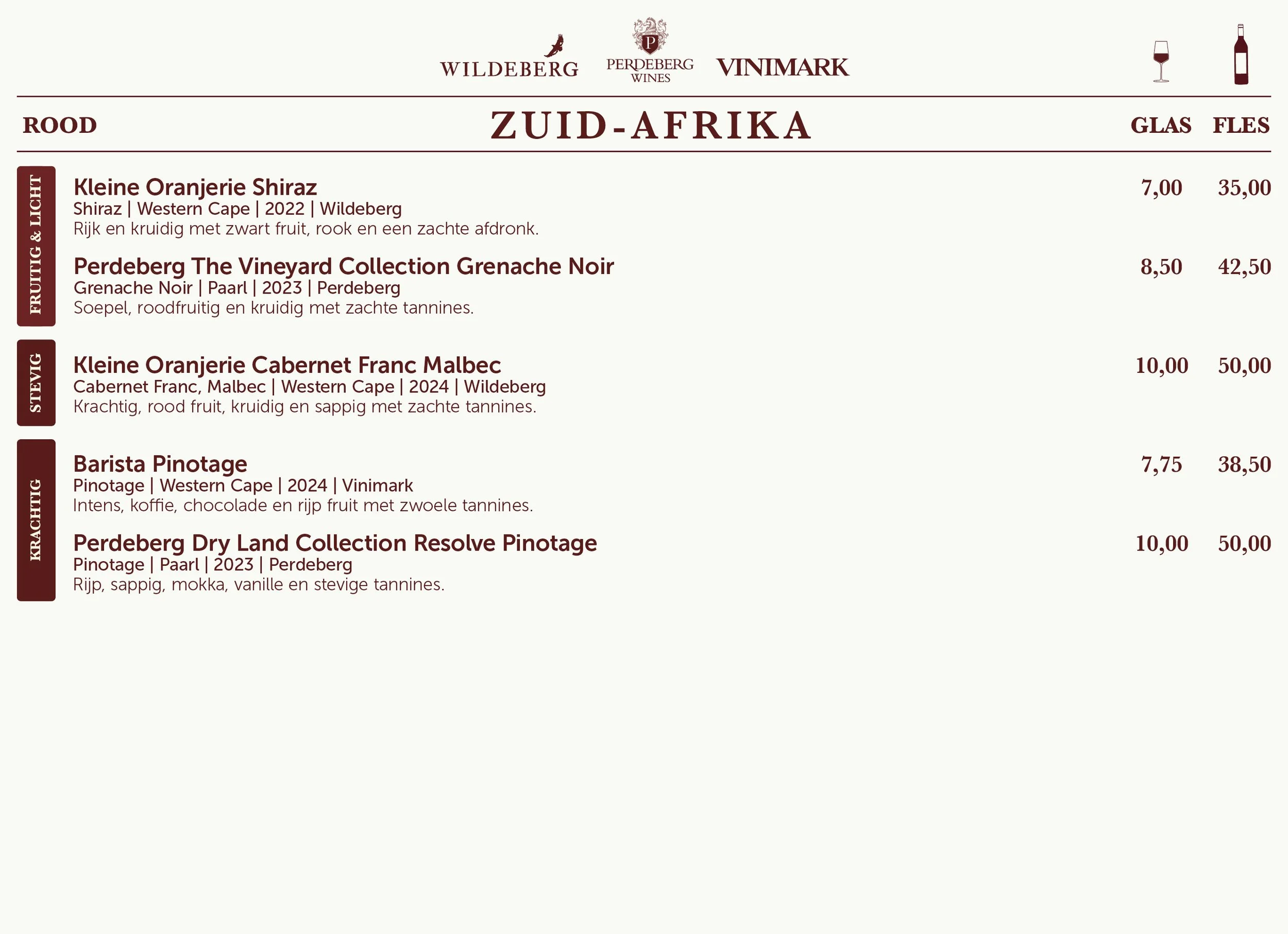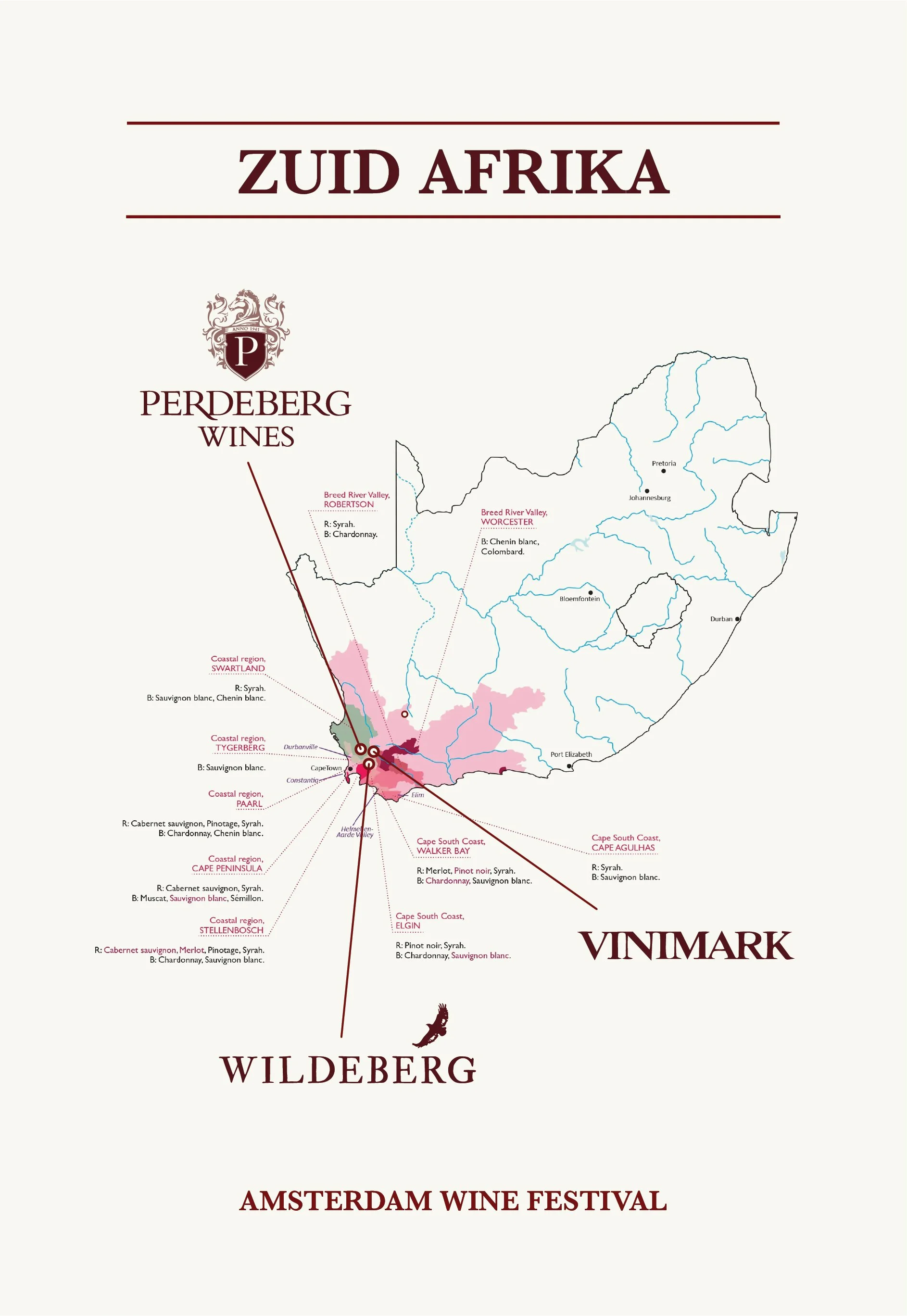 De rijke wijncultuur van Zuid-Afrika komt tot leven door de expertise van Vinimark en de karaktervolle wijnen van Wildeberg en Perdeberg. Vinimark is de grootste onafhankelijke wijnspecialist van het land en verbindt al sinds 1985 met veel passie de mooiste Zuid-Afrikaanse wijnen met liefhebbers over de hele wereld. Met een breed portfolio van meerdere topmerken zorgen zij ervoor dat karaktervolle wijnen met passie en plezier hun weg vinden naar de kenner.