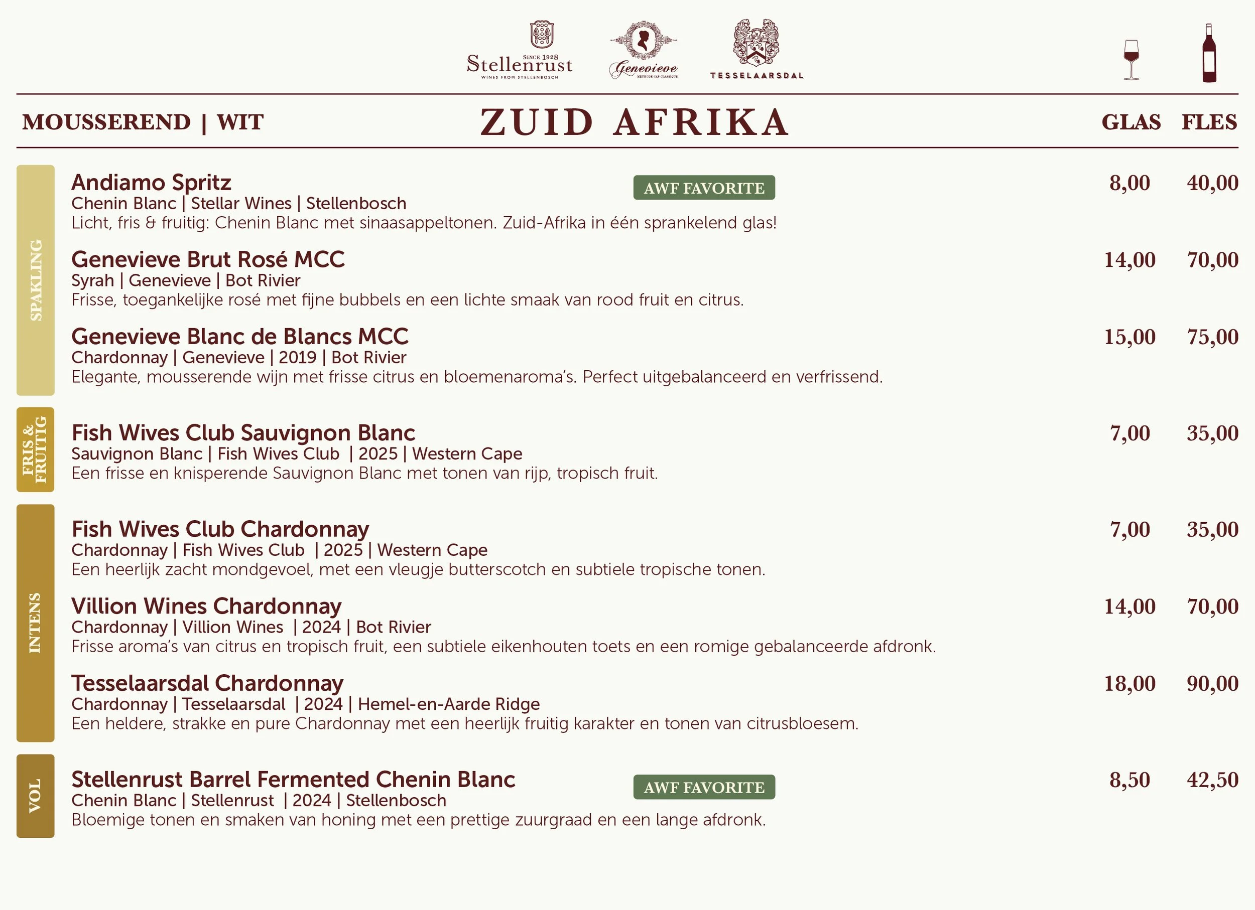 Naast de verfijnde wijnen van Tesselaarsdal, de elegante bubbels van Genevieve (MCC) en de karaktervolle witte wijnen van Villion, schitteren ook de klassiekers van het historische Stellenrust en de toegankelijke, fruitige stijlen van The Fishwives Club op de kaart. Van de frisse Sauvignon Blancs uit de kustregio's tot de krachtige Pinotage uit Stellenbosch en de zomerse rosé van Oude Kaap: deze selectie biedt een prachtige dwarsdoorsnede van het beste wat Zuid-Afrika te bieden heeft.
